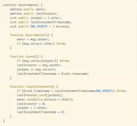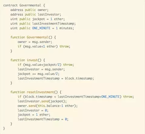 GovernMental 是一个“庞氏骗局游戏”型合约。严格来说,其实不能叫骗啦,因为庞氏骗局的规则被公开地写在合约里。在这个合约中,每个人通过向合约中转一笔钱来加入这个庞氏骗局游戏。合约通过两个数组记录参与者的地址和每个参与者转入的钱的数量。如果最后一个人加入后 12 小时后都没有下一个人加入,那么最后一个人就可以获得全部的收益。(这个设定是不是有点像著名的 Fomo3D,值得注意的是,Fomo3D 的出现晚于这篇论文呦。)