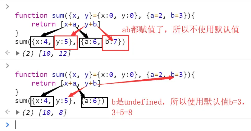 2.function sum({x, y}={x:0, y:0}, {a=2, b=3}){