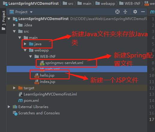 3.配置Spring配置文件 spring配置文件的名称必须是web.xml文件中的servlet-name加上-servlet后缀,比如 springmvc-servlet.xml。这样spring框架才能找到它。