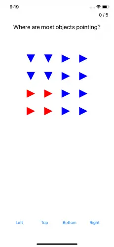 Recall从Left vs Right brain应用程序中的游戏中获取灵感。 游戏的目标是为视图中的对象选择流行的方向。 一旦做出选择,就会显示一组新对象。 在比赛结束前你有五次尝试。
