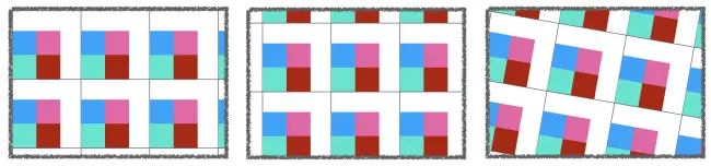 第一个显示未更改的模式。 在第二个中,您会看到translated的模式。 第三个显示旋转的图案。 同样,图案单元周围的黑色边框突出了它的边界。