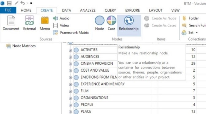 无论您是进行小规模定性分析还是从大型混合方法数据集构建计算本体,在Nvivo中对关系或关系类型进行编码提供了一种有用的方式来探索你的工程中的项目(例如节点)如何与另一个相连。创建关系和关系类型相对容易: