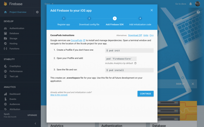 入门项目已包含SDK,因此只需单击CONTINUE即可。 最后一页介绍了在应用启动时如何连接Firebase: