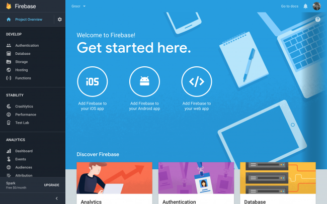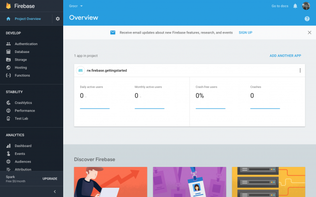 然后,您将为您创建一个干净的Firebase控制台。 不要担心花钱;此Firebase教程中的所有内容都可以使用免费计划完成。