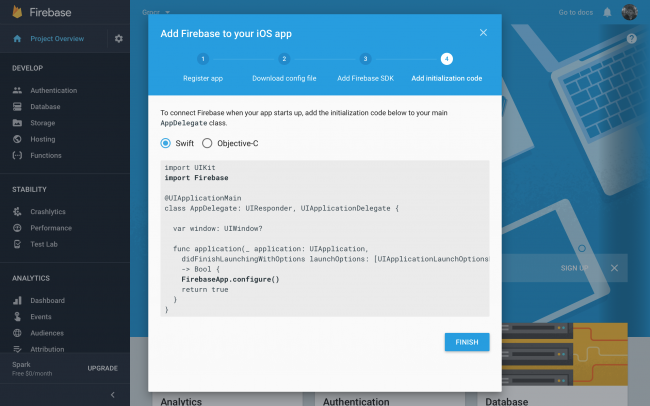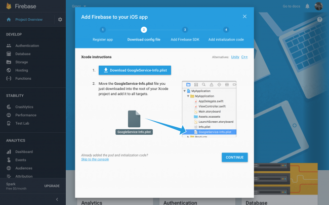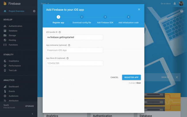 单击REGISTER APP,然后单击Download GoogleService-Info.plist。 按照说明将其移动到Xcode中的Grocr项目。