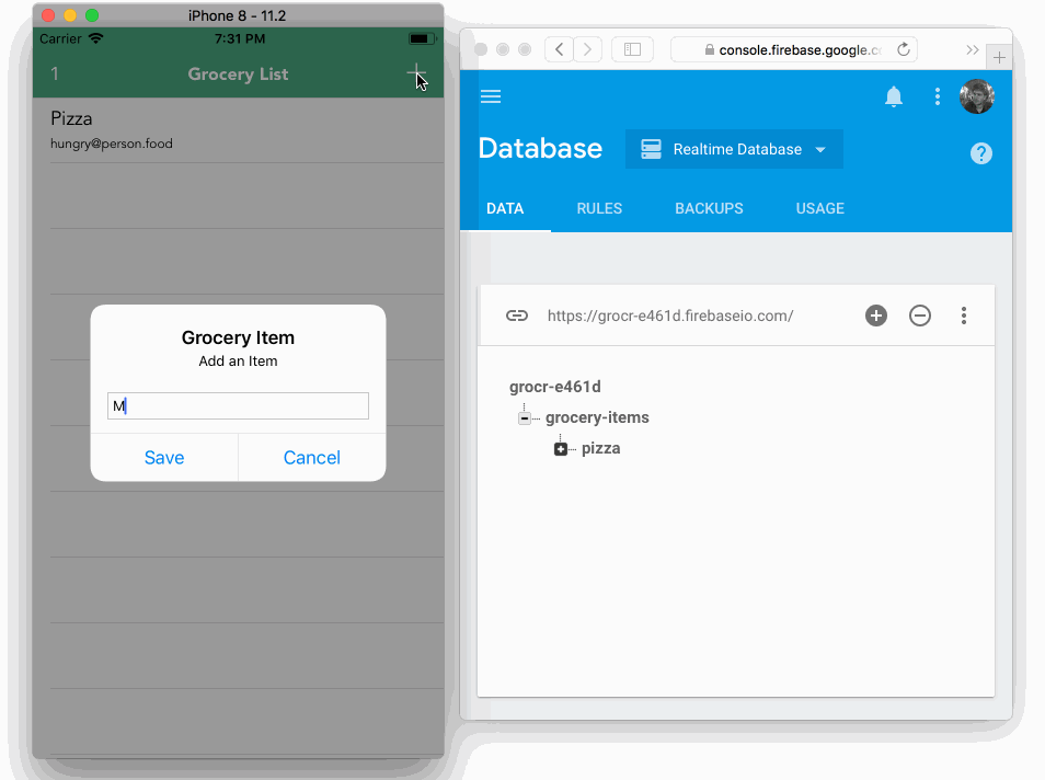建立并运行。 在Firebase仪表板中,选择DATA选项卡并将浏览器窗口放在模拟器旁边。 在模拟器中添加项目时,您会看到它出现在仪表板中:
