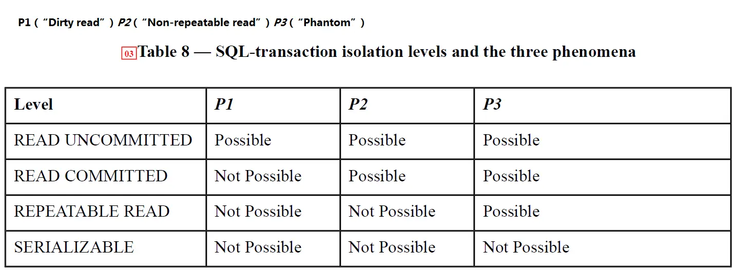 - 幻读(Phantom Read):一个事务的两次查询中数据不一致。例如一个事务查询数据,而另一个事务却插入新的数据,先前事务的查询中,发现一些数据是之前查询中没有的