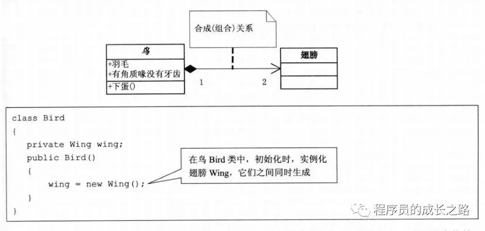 在这里鸟和其翅膀就是合成(组合)关系,因为它们是部分和整体的关系,并且翅膀和鸟的声明周期是相同的。