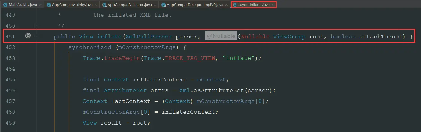 我们知道,我们传入的是int,是xxx.xml这个布局文件,在R文件里面的对应int值。LayoutInflater拿到了这个int之后,又干了什么事呢?
