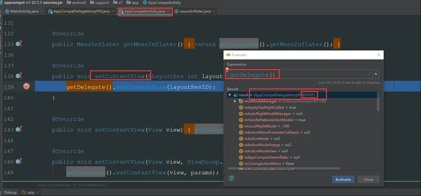 OK,这里暴露出了两个方法,getDelegate()和setContentView()