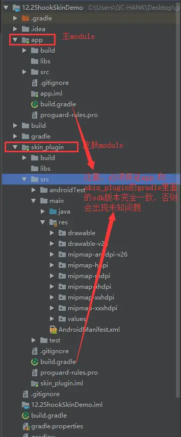2. 皮肤包 skin_plugin module的gradle sdk版本最好和app module的保持完全一致,否则无法保证不会出现奇葩问题.