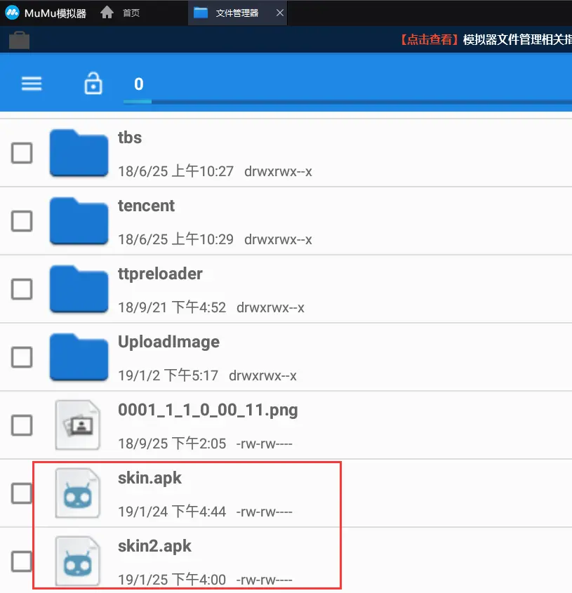 3. 用皮肤包skin_plugin module 打包生成的apk文件,常规来说,是放在手机内存里面,然后由app module内的代码去加载。至于是手机内存里面的哪个位置,那就见仁见智了. 我是使用的mumu模拟器,我放在了最外层的根目录下面,然后读取这个位置的代码是: