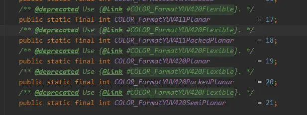 参考 Android: MediaCodec视频文件硬件解码,高效率得到YUV格式帧,快速保存JPEG图片 得知 API 21 新加入了MediaCodec的所有硬件解码都支持的 COLOR_FormatYUV420Flexible 格式。它并不是一种确定的 YUV420 格式,而是包含了 COLOR_FormatYUV411Planar、COLOR_FormatYUV411PackedPlanar、COLOR_FormatYUV420Planar、COLOR_FormatYUV420PackedPlanar,COLOR_FormatYUV420SemiPlanar 和 COLOR_FormatYUV420PackedSemiPlanar 这几种,所以只能确保解码后的帧格式是这几种中的其中一种。MediaCodecInfo 源码中可以看到,在API 21引入 YUV420Flexible 的同时,它所包含的这些格式都 deprecated 掉了: