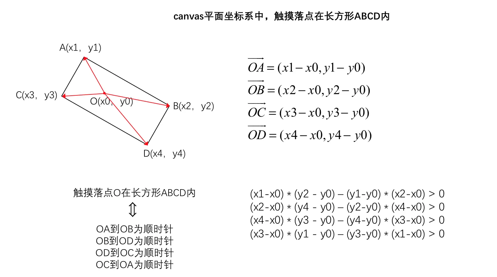 而当用户触摸canvas时,通过触摸事件,可以拿到用户触摸的坐标。如果触摸坐标在长方形顶点坐标"内部",则表示触摸到了元素。于是,我们的问题可以抽象为: