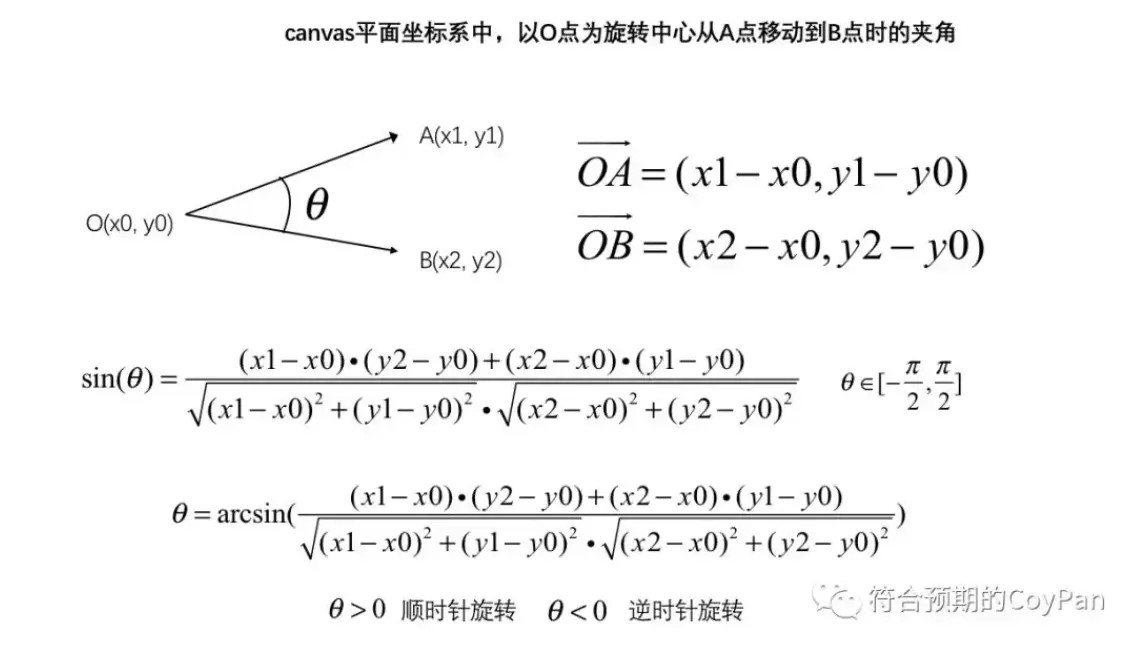 1、一般以canvas中的元素的中心为旋转原点,用户在canvas中触摸移动时,通过事件监听函数得到的前后两次触摸点的位移是很小的,与旋转中心形成的向量夹角必然是小于90度的。