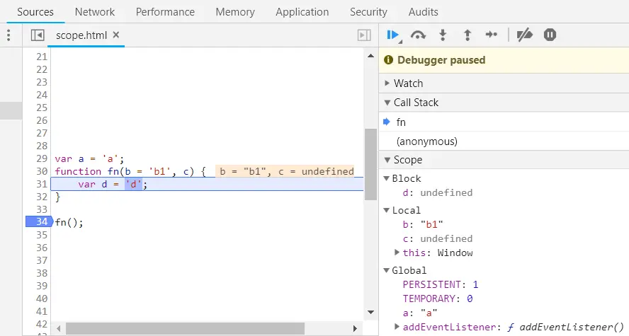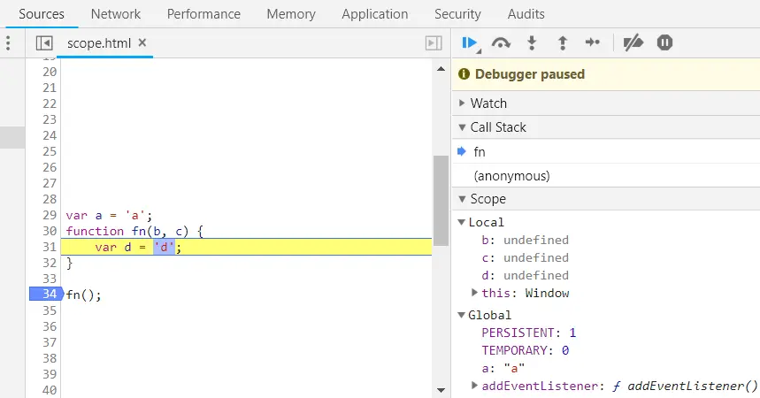 a 处于全局作用域,b、c、d 都处于本地作用域,也就是说,函数参数与函数体是同一个作用域。