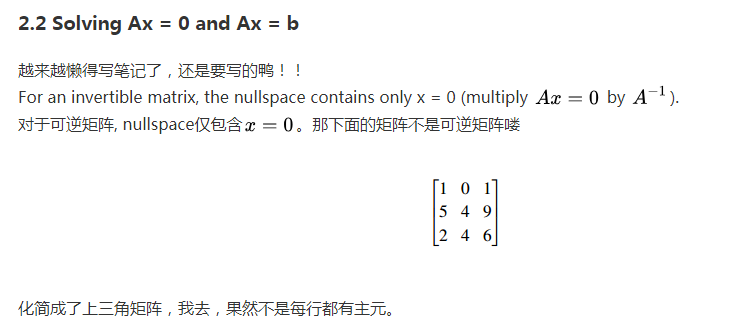Chapter 2 向量空间 叶辰星 2019-02-01 215 阅读1分钟 2.2 作者说square matrix的column space是whole space,nullspace 为。这节要解决的问题是那些column space不是whole space,nullspace 不仅为的matrix。 同及有相同解??? 通过elimination将 -> -> 的pivot上方的元素都为0