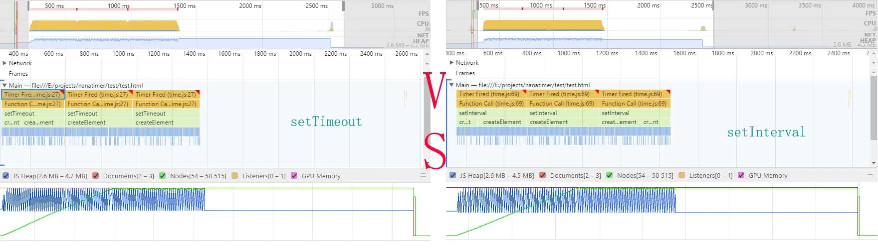 接下来是很有压力的情况下?。哈哈苍天饶过谁,在相同时间,相同压力的情况下,都出现了跳帧超时,不过两人的原因不一样setTimeout压根没有执行,而setInterval是因为抛弃了相同队列下相同定时器的其他callback也就是只保留了了队列中的第一个挤进来的callback,可以说两人表现旗鼓相当。