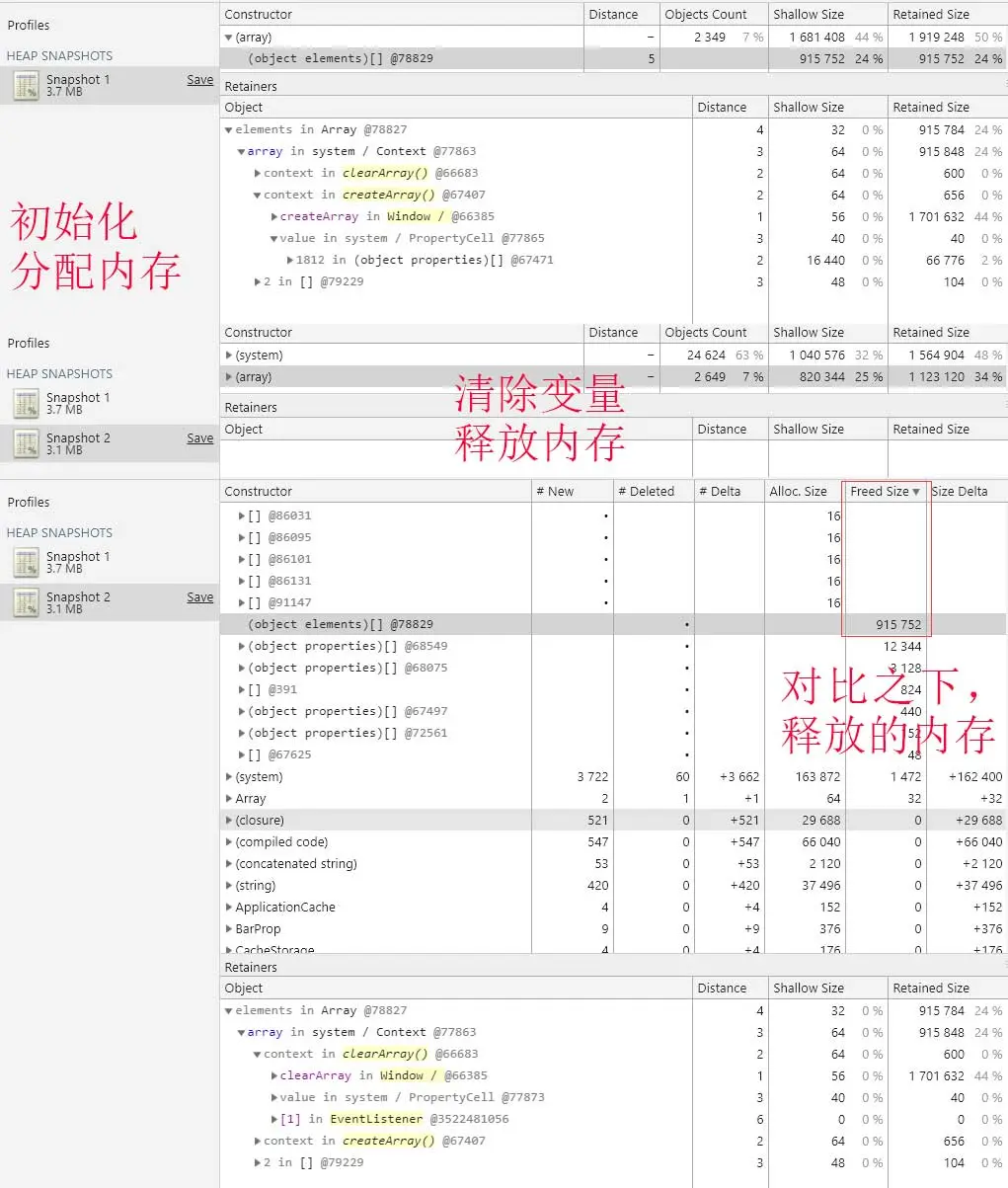 实践是唯一获取真理的方式。通过chrome的测试工具,我们可以发现清除分配给变量的内容,可以释放内存,这也是为什么有许多代码结束之后会xxx=null,也就是为了释放内存的原因。