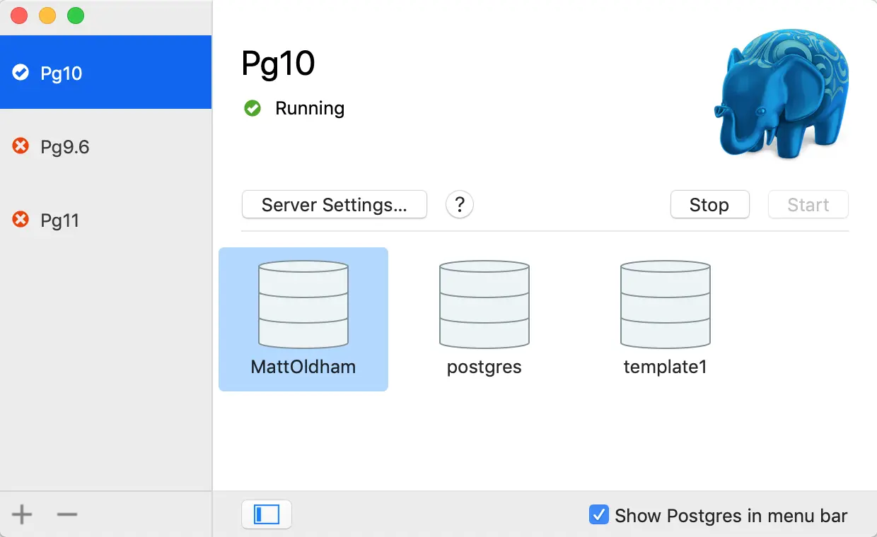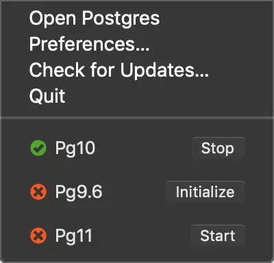 Postgres.app is also accessible from the menu bar, allowing you to quickly start/stop PostgreSQL.