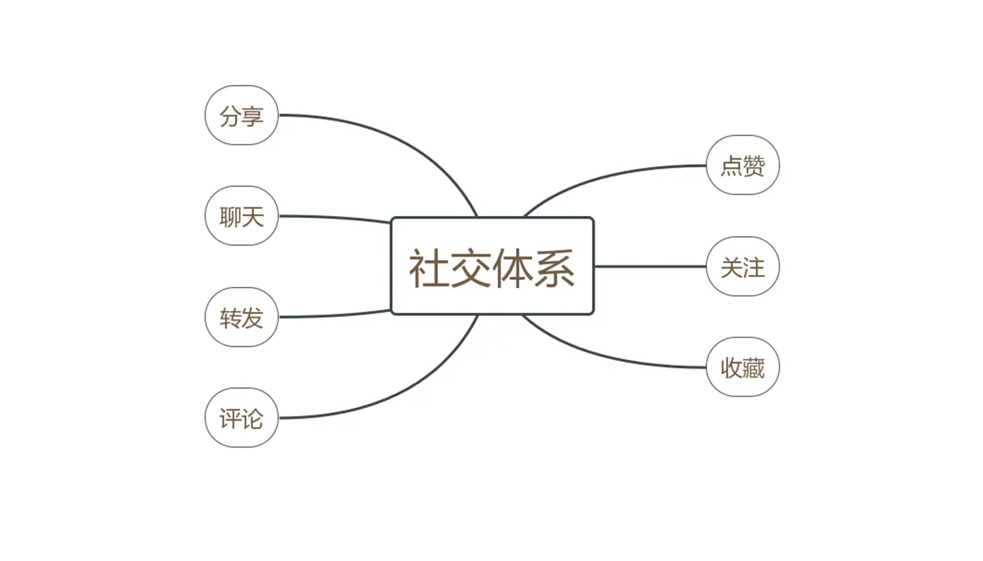 如下图所示为大多数软件的社交体系主要构成,本质上都是用户之间互动的方式,按照操作的复杂程度或者步骤的多少,我将这些互动方式分为分为轻量互动、中量互动及重量互动三种。