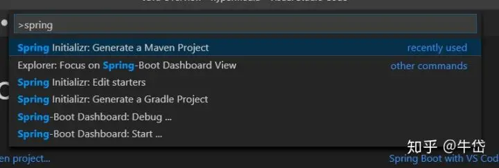 在搜索栏前输入”>“,搜索所有可使用的命令 比如我想使用spring initializr扩展的命令, 创建一个Maven工程: