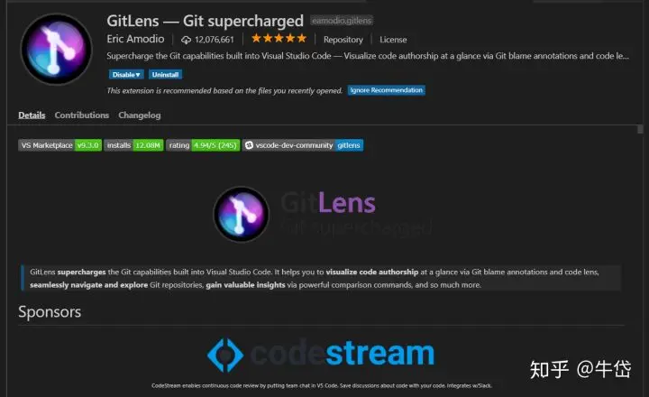 7. 使用安装量高达一千两百万的Gitlens扩展,助你更好地进行代码合作,查看代码更改历史。