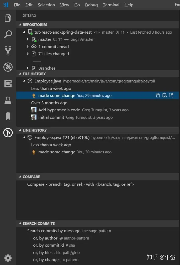 在左侧的action bar中,新出现了GitLens的图标,点击后,详细查看branch,master,commit的信息: