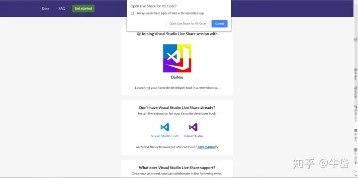 可以看到这个代码实时会议是我开的,然后直接点击自动弹出的Open Live Share for VS Code,你的VScode就会自动启动,打开之后,你已经进入了该代码实时会议,可以和大家开始共享整个工程,甚至可以用voice call和他们实时语音交流,共同享受代码协作开发的乐趣。
