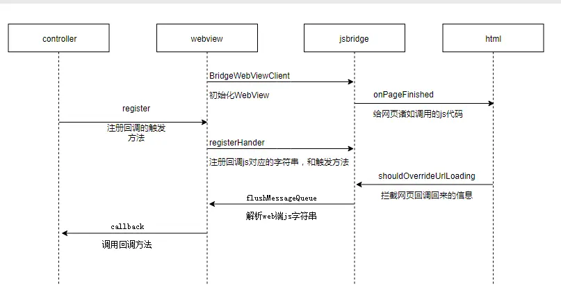 下面是jsbridge原理,jsbridge通过注入js调用代码到html里面,html中通过调用相应函数,然后jsbridge通过shouldOverrideUrlloading来拦截对应拼接的字符串,然后回调到注册触发的webview注册的registerHandler函数完成方法实现。