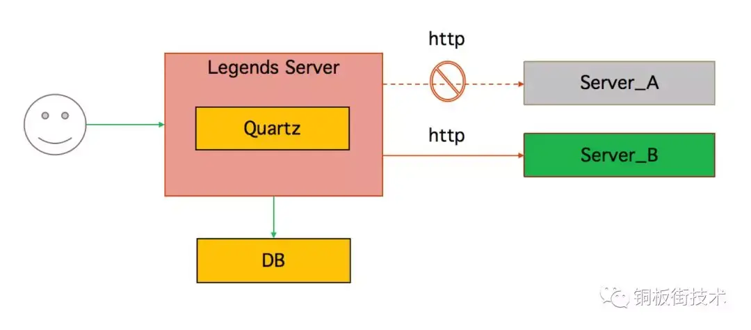 1.0 版本的任务调度系统架构如下图1:由一台服务器负责管理所有需要执行的任务,任务的管理与触发动作都由该机器来完成,通过内置的 quartz 框架,来完成定时任务的触发,在配置任务的时候,指定客户端 ip 与端口,任务触发的时候,根据配置的路由信息,通过 http 消息传递的方式,完成任务指令的下达。