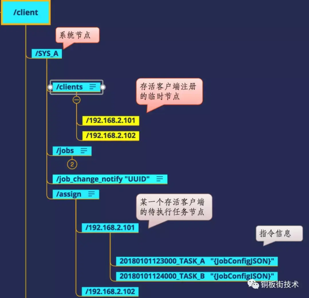 任务调度服务器通过监视 /clients 节点的子节点数据,来发现有哪些机器是可用(这里通过监视点来永久监视客户端节点的变化情况)。