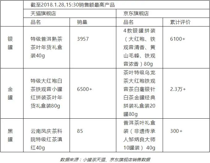 首先看一组小罐茶天猫旗舰店、京东旗舰店黑、金、银三种不同罐装的茶叶销售表格: