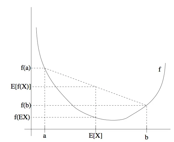 图中在 $y$ 轴上也标出了 $f(a)$, $f(b)$ 和 $f(E[X])$。接下来函数的期望值 $E[f(X)]$ 在 $y$ 轴上就处于 $f(a)$ 和 $f(b)$ 之间的中点的位置。如图中所示,在这个例子中由于 $f$ 是凸函数,很明显 $E[f(X)] ≥ f(EX)$。