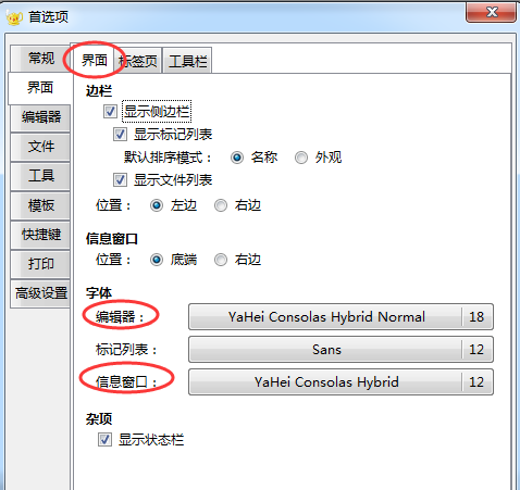 在此设置编辑器与信息窗口的字体与大小,推荐 YaHei Consolas Hybrid 字体哦O(∩_∩)O~