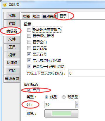 设置方式为:选择菜单 编辑 ▶ 首选项, 再依次单击 “编辑器” 和 “缩进” , 启用长行标志, 并把“ 列 ” 中的值设置为 79。