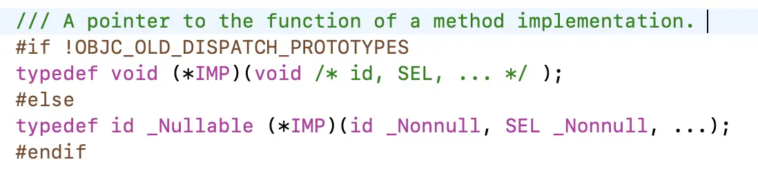 method_t有方法名称(name)、返回值类型和参数类型的编码(types)、指向函数的指针(imp)。