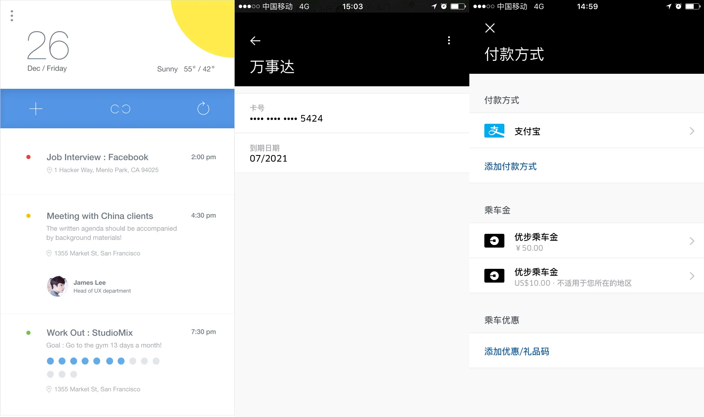 图2(1.日志软件-Android系统;2、3.Uber-iOS系统)