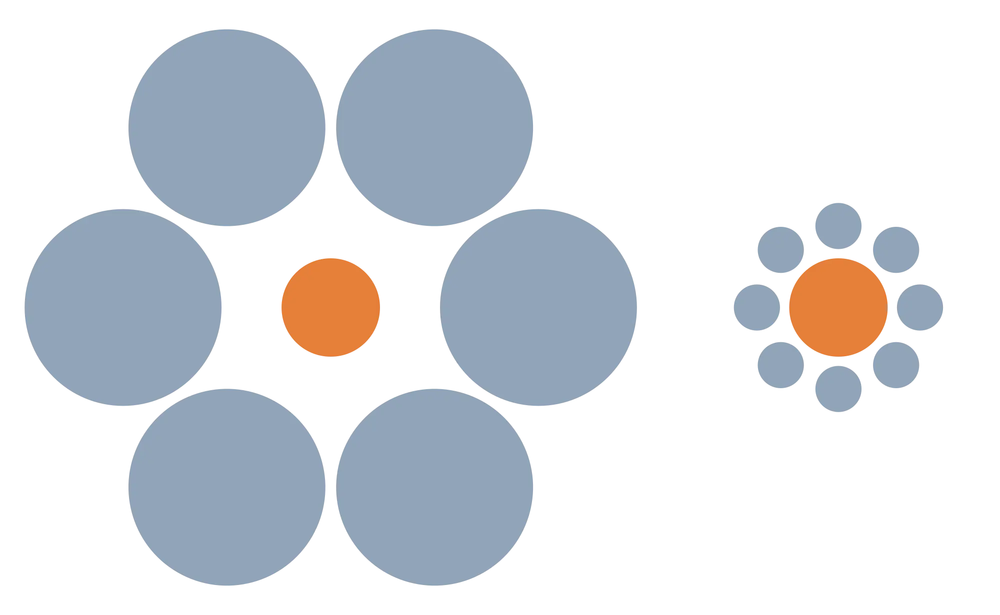 赫尔曼*艾宾浩斯(Hermann Ebbinghaus)是著名的研究人类记忆的心理学家,出生于德国,任职波兰布雷斯劳大学教授。他主要研究人类如何进行持续性记忆的(题外话:艾宾浩斯记忆曲线非常有名)。上图是他发现的视错觉图。位于中间的两个橘黄色的圆大小相同,但是看起来右侧的明显偏大。右侧橘黄色圆的四周是小圆,所以看起来比实际的大,而左侧的橘黄色圆周围是大圆,因此它看起来比实际的要略小。