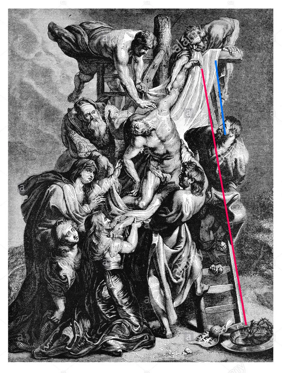 生于16世纪佛兰德地区(现跨越比利时、荷兰、法国的一个区域)的画家彼得*保罗*鲁本斯(Peter Paul Rubens)的《耶稣下十字架》。右侧穿黑色衣服的人物所登的梯子,在人物的上方和下方错开了(下图)。有一种观点认为,鲁本斯注意到如果画成直线的话就会出现波跟多夫错觉(大家自己去查吧~),梯子会看起来上下错开,因此才特意将梯子上下错开画。这个观点由加拿大温尼伯大学的陶珀(D.R.Topper)发表于1984年。