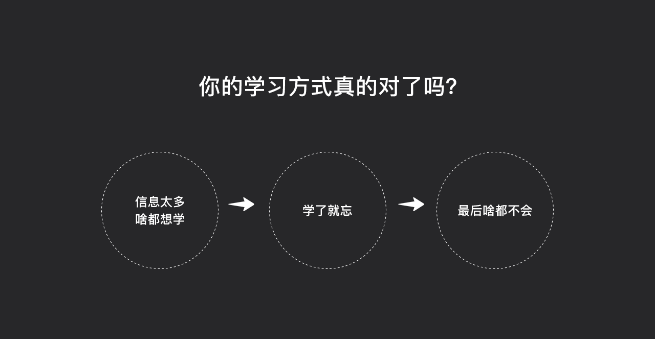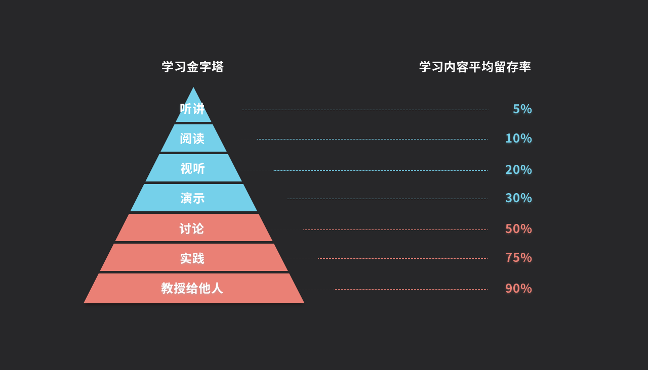 在开始正文之前,我希望大家能够理解什么是最有效的学习方式。在当前的大环境下,各个平台学习类的教程或者文章层出不穷,我们似乎总是有学不完的知识,每天也都在积极地学习,当时看完觉得收获颇丰,但一天工作下来也许看过的东西就忘了50%,甚至过了一周后发现自己已经什么都忘了。