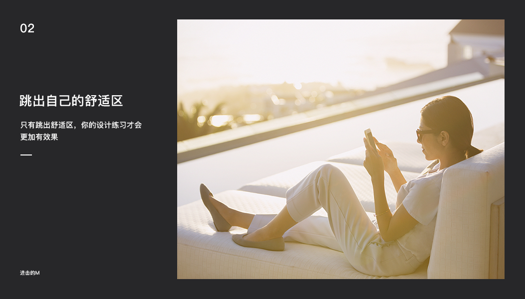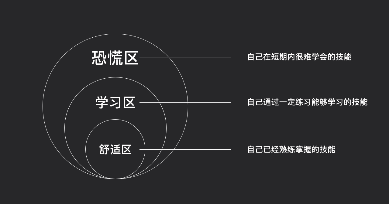 跳出舒适区,指的是来到学习区,去有意识地练习那些你了解过,但是不能熟练应用的技能。例如你对界面的设计已经比较熟练了,但是你对交互动效这一部分仍然感到比较陌生,那么如果继续坚持界面练习可能只是简单在堆积你的练习数量,这时你更应该去尝试一下界面的一些交互效果并将其制作出来。