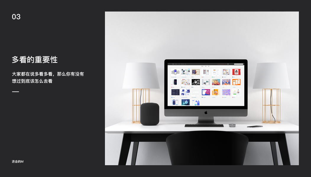 牛顿曾说“我之所以比别人看得远一些,是因为我站在巨人的肩膀上”,那么在我的理解范围内,多看即是站在巨人的世界里看设计。