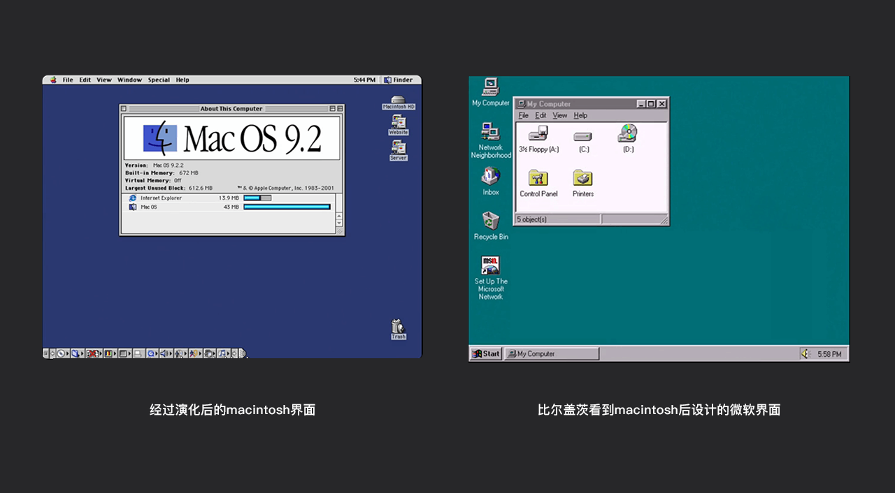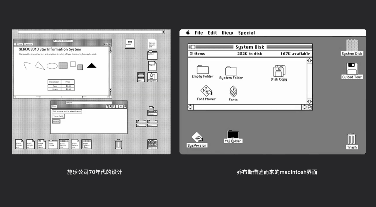 毕加索曾说过这样一句话:好的设计师借鉴,伟大的设计师偷。乔布斯也曾说过类似的话。举个例子,我们可以先看左边一个比较古老的界面-施乐公司70年代的界面,再看右边乔布斯拿来改进的做的macintosh界面: