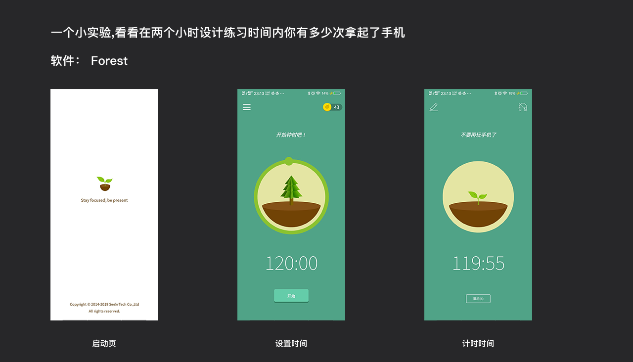 我们可以做一个小实验,在自己手机上下一个Forest[番茄时钟],设定两个小时的设计练习时间,看看在这个持续时间内你有多少次会情不自禁地拿起手机看消息。(我在做这个测试的时候会发现有很多次都会无意识拿起手机看信息),由此可见我们即使是在练习时间内也会存在很多浪费时间的小动作,如果丢掉这些小动作,我们在有限时间内的产出将会大大提升。