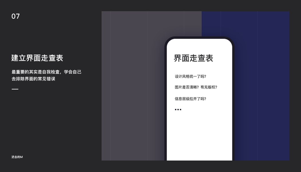 就像在学校时,老师总是强调我们试卷答题完成后一定要进行自我检查去排除一些不该犯的错误。同理,设计也是一样,每当我们初步完成了设计界面后,我觉得最重要的也是进行自我检查,排除一些界面常见的错误。当然,我说的走查并不是单纯看文字等显而易见的错误,而是按照一个优秀的界面要求去走查我们的界面: