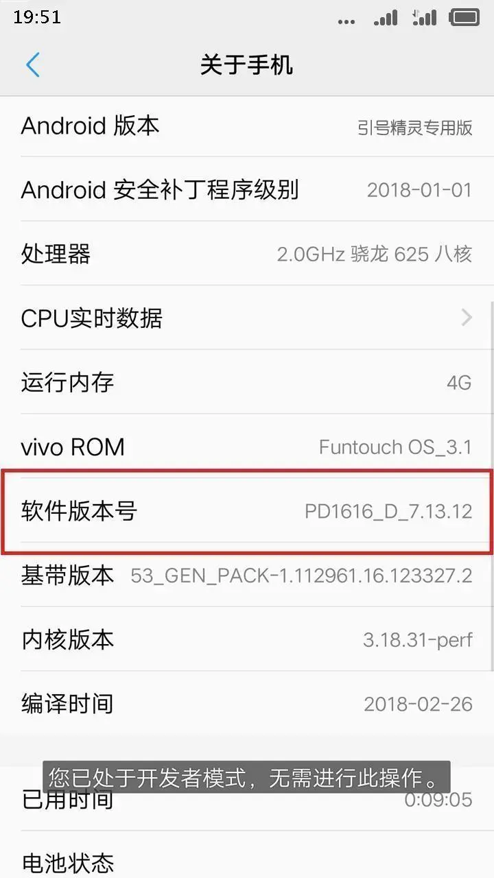 然后,进入到关于手机界面之后,连续点击“软件版本号”一栏,直到看出弹出您已进入开发者模式的提示文字。