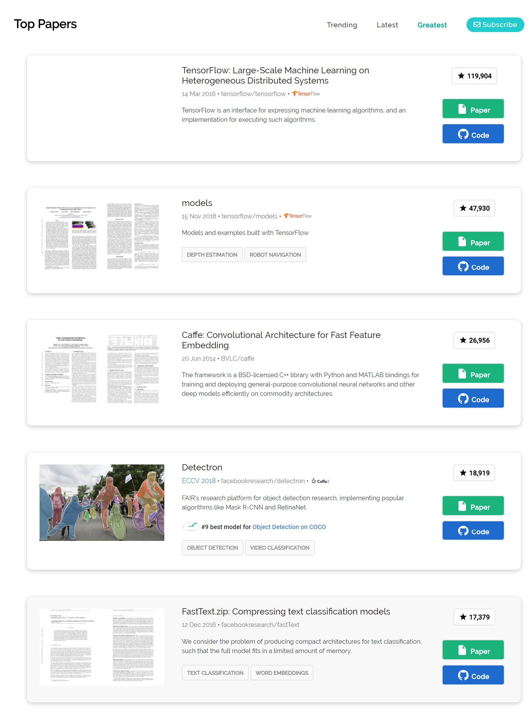 你可以按标题关键词查询,或者研究领域关键词,如图像分类、文本分类等搜索,也可以按流行程度、最新论文以及 Github 上 Star 数量最多来排列。这个网站能让你跟上机器学习社区流行的最新动态。
