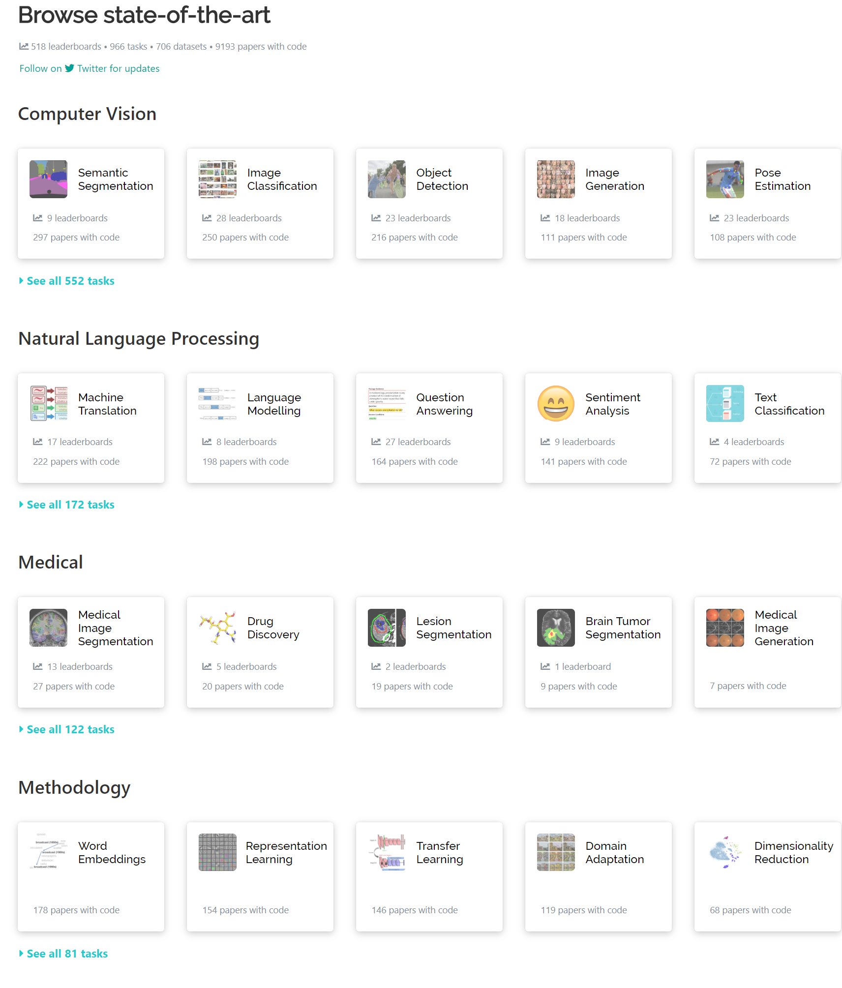 这个网站主要是解决另一个问题--寻找一个领域目前最好的(State of the art, Sota)算法的论文以及实现代码。这也是刚接触到一个新领域时候,必须要做的事情,先找到最新最好的算法论文,然后根据这篇论文的代码实现,先跑下代码,接着再去了解细节,或者是根据它的参考论文,来学习这个领域最近几年的论文(一般是 3 年到 5 年内的),逐渐熟悉这个领域的研究方向和难点所在。