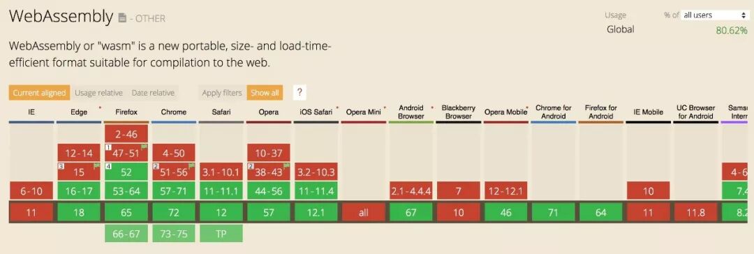 WebAssembly 简称 Wasm 是一种二进制格式的编码,可以在现代浏览器中执行。Wasm 起源于 Mozilla 早期开发的 asm.js。它的开发团队主要来自Mozilla、Google、Microsoft、Apple,代表着四大主流浏览器 Firefox、Chrome、Microsoft Edge、Safari 。Wasm 被设计的目的是为了让浏览器的 JavaScript 引擎执行脚本的速度可以接近原生机器码。为了让人类能够阅读和编辑, Wasm 还提供了类汇编的文本格式表达。卧槽!这是要让我们手写汇编吗?当然不是!Wasm 被设计成一种可移植的编译目标,可以由其他高级语言,像:C/C++/Rust/Golang,编译而来。WebAssembly 在 2017 年开始进入国外大众开发者的视野,2018 年在国内有很多技术大会都出现 WebAssembly 相关主题的演讲。截止目前,全球 80.62% 的用户的浏览器已经支持 Wasm。